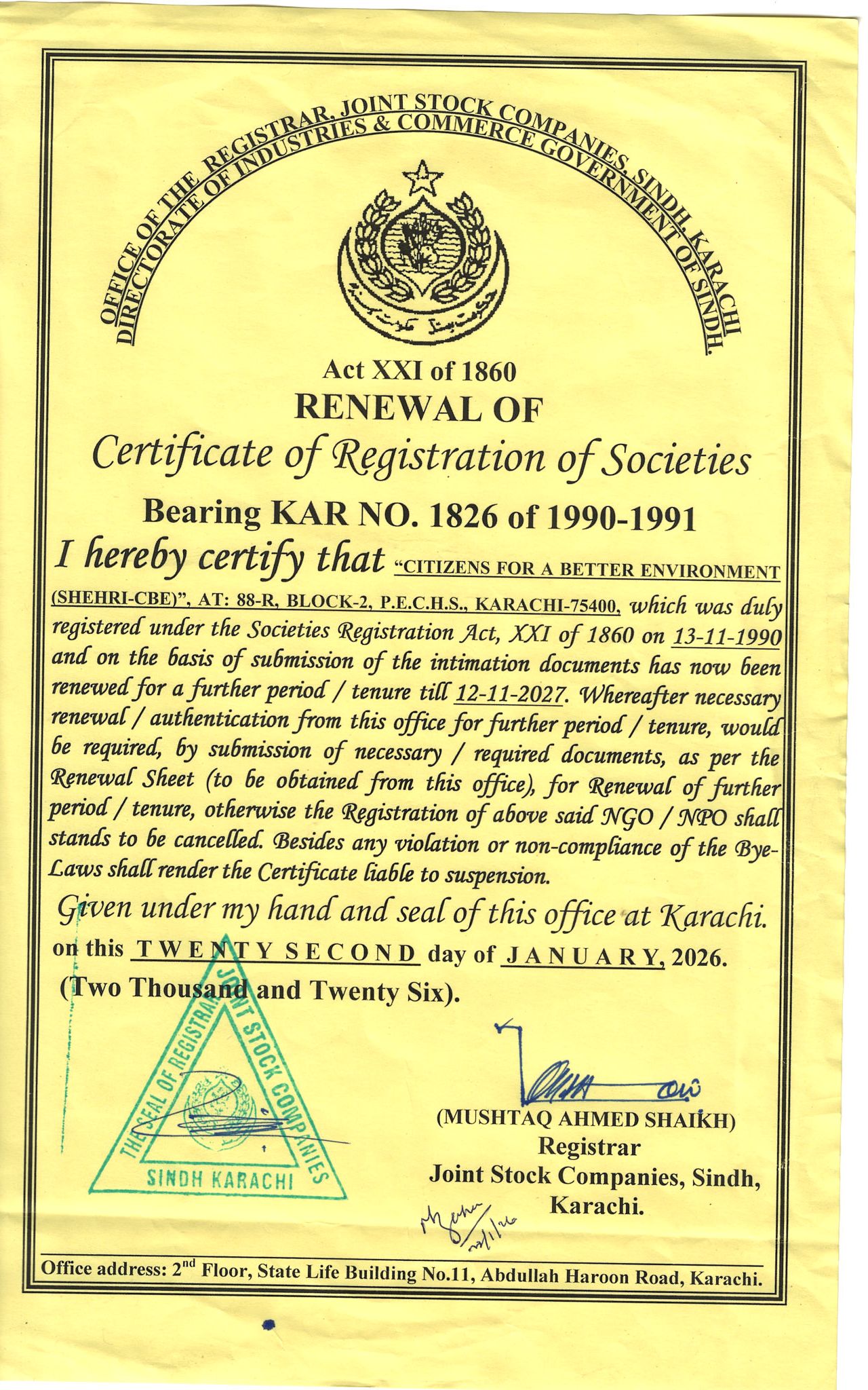 Shehri-Citizens for a Better Environment was formed in 1988 (based in Karachi City), as a non-political, not-for-profit, non-commercial, non-governmental organization (under the Societies Registration Act XXI of 1860) by a group of concerned citizens to provide the citizens with a platform to effectively voice their concerns in determining their future and taking action in arresting the deterioration in their living environment and proper reform with a view to improve the same. The organization was formed for the attainment of the following overriding objectives:
